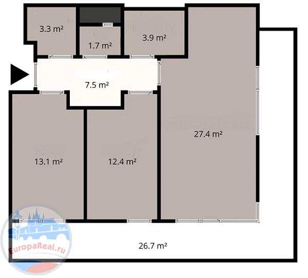 Планировка: гостиная с кухонным уголком (27,4 м²), две спальни (13,1 м² и 12,4 м²), ванная комната (3,9 м²), отдельный туалет (1,7 м²), прихожая (7,5 м²) и кладовая (3,3 м²). Кухня оборудована встроенной бытовой техникой, окна имеют тройной стеклопакет. Благодаря современным технологиям, квартира предлагает максимальный комфорт.